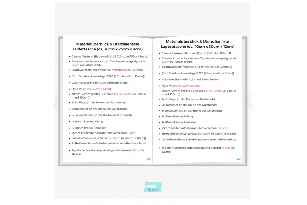 You can find the exact materials and quantities in the product photos. For the outer fabric, sturdier fabrics such as canvas and leatherette are suitable. For the inner lining, simple cotton woven fabric works. To make the bag sturdier and more stable, it is advisable to use an appropriate volume fleece.