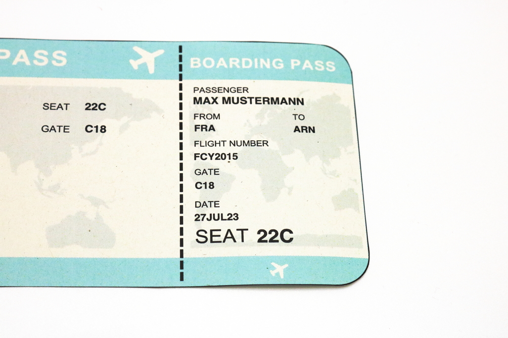 - Customizable boarding pass (the document is in DIN A4 format and contains 3 boarding passes whose blue fields (see product photo) can be individually adjusted.)