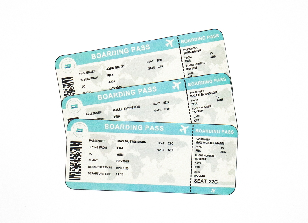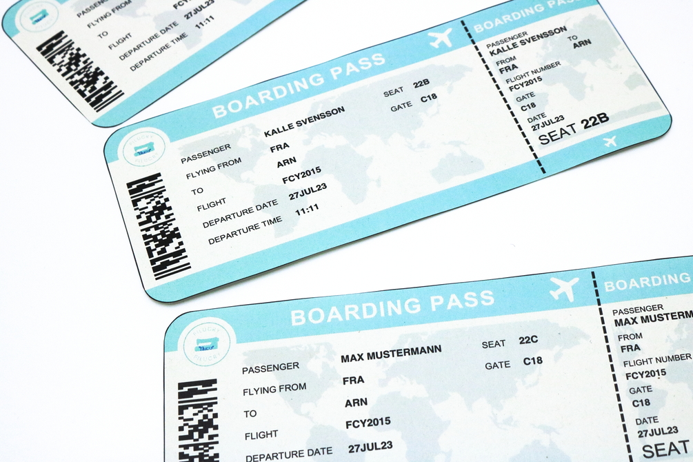 - Customizable boarding pass (the document is in DIN A4 format and contains 3 boarding passes whose blue fields (see product photo) can be individually adjusted.)